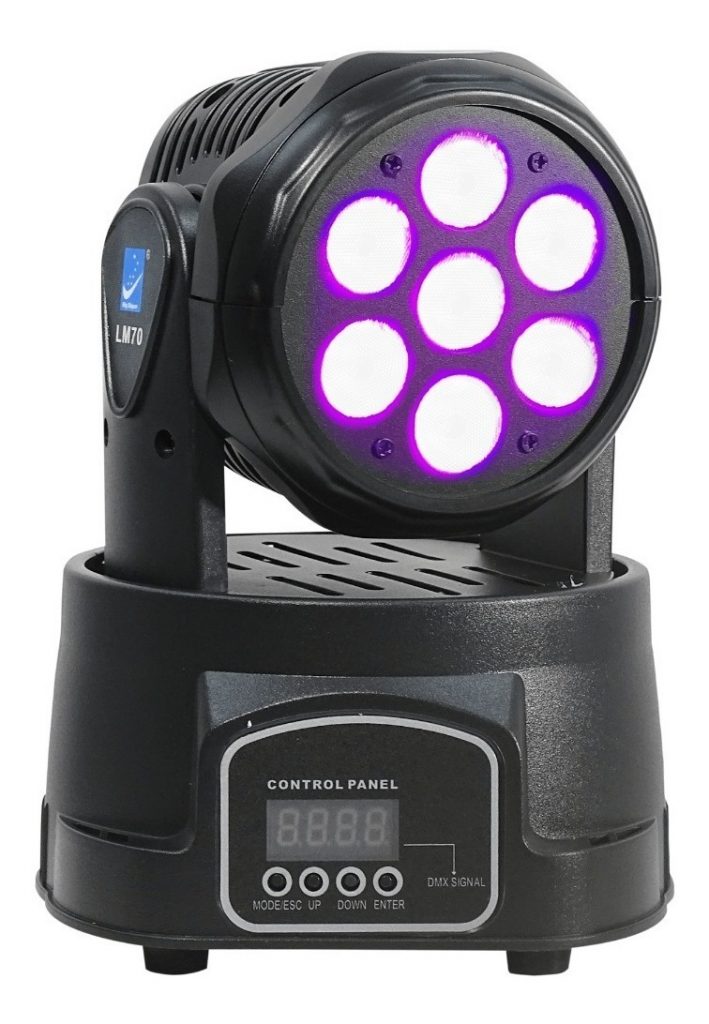 Cabeza móvil 7 Led *8Watts RGBW (4 en 1) Modo: automático/ audio rítmico/ DMX/ master – slave 9/ 16 Canales DMX Pan 540°, tilt 270°