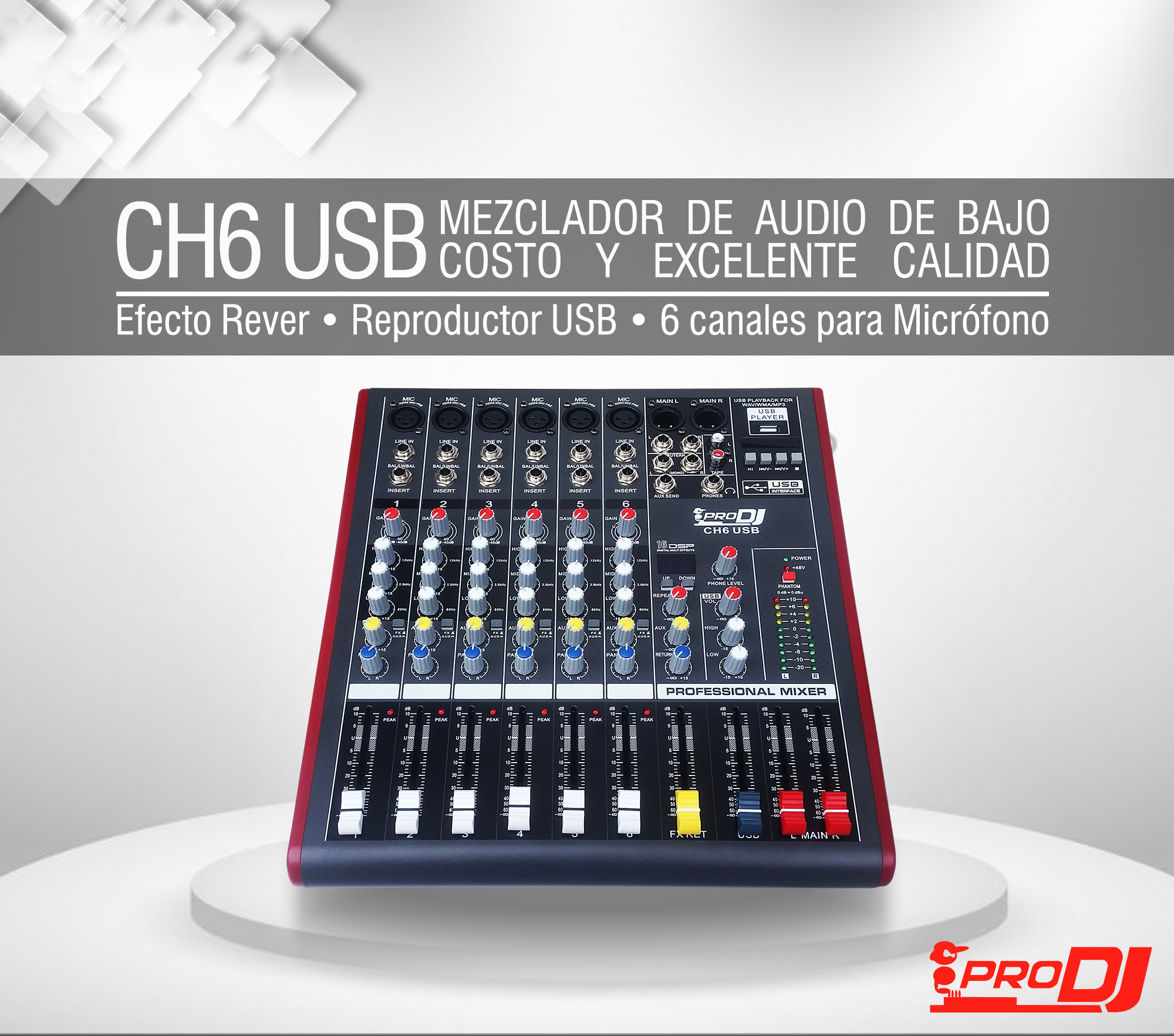 Consola Análoga con Bluetooth 6 entradas híbridas (xlr o línea). Salida master por xlr. Salida rca. Módulo reproductor mp3 con entrada usb. Canal independiente para control usb. Módulo de efectos. Puerto insert por canal.