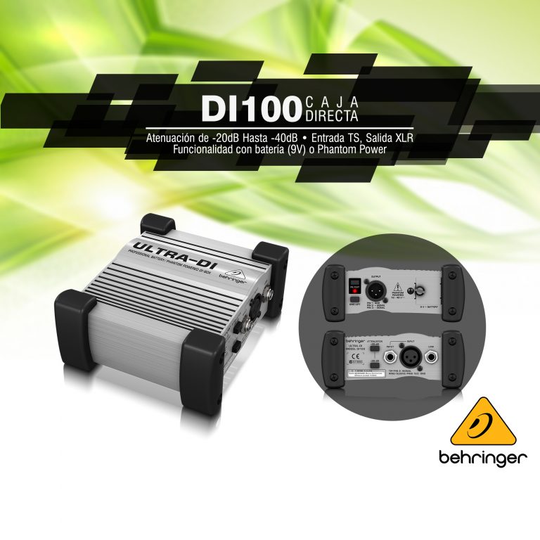 Caja directa activa 1 Canal Salidas Balanceadas Entrada jacks de 1/4 y XLR Conector link Salida balanceada XLR Atenuador Requiere batería 9V.